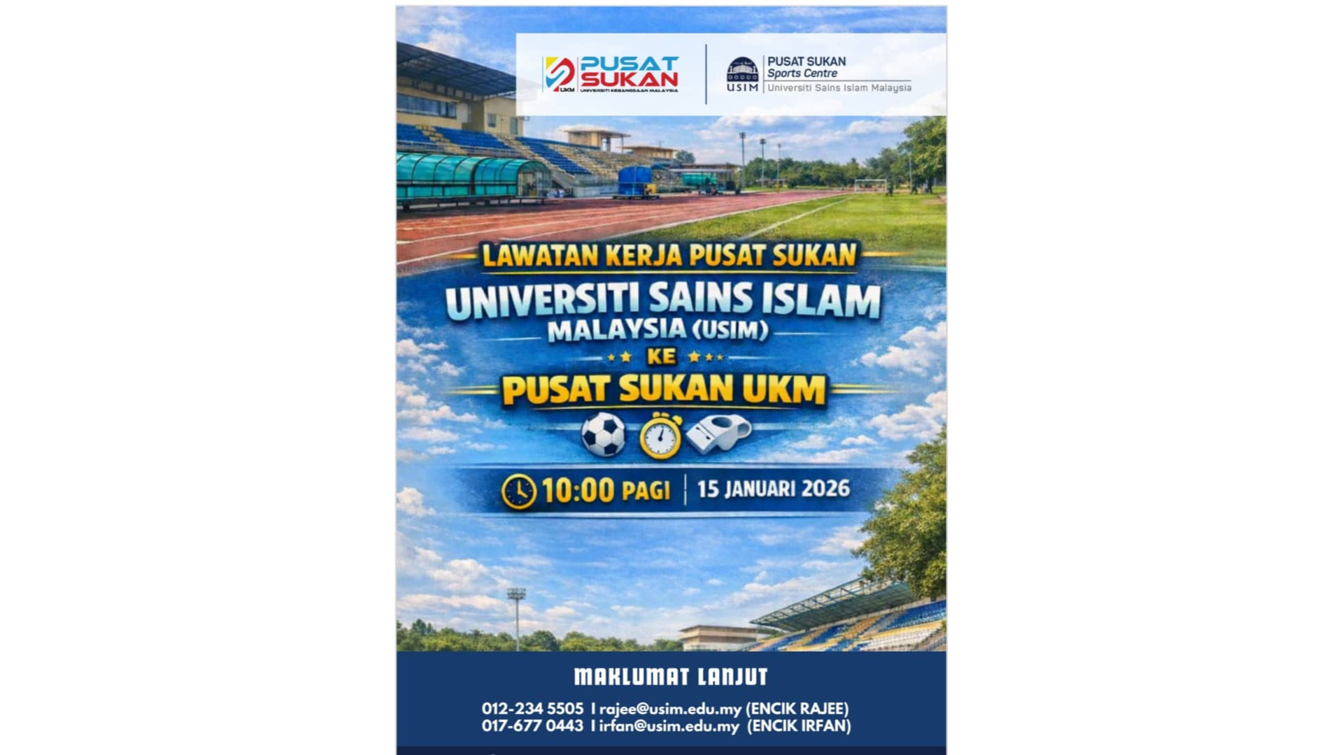 Inisiatif ini merupakan komitmen Pusat Sukan untuk menjayakan agenda USIM Cemerlang USIM Disayang dan USIM@Komuniti bagi lebih mendekatkan peranan USIM bersama warga komuniti menerusi pendekatan sukan yang membawa kepada aspek kebersamaan dan perpaduan.